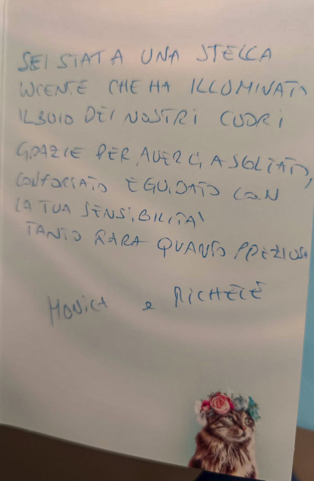 "Sei stata una stella lucente, che ha illuminato il buio dei nostri cuori, grazie per averci ascoltato, confortato, e guidato con la tua sensibilità tanto rara quanto preziosa."